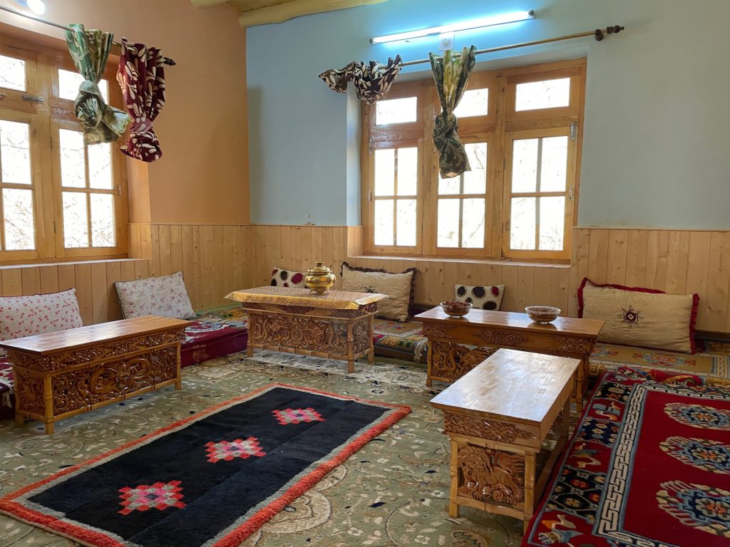 In search of a centrally located homestay, overlooking lower Takmachik and leading up to the main village? This homestay is characterised by its efficient land utilisation, covering a greenhouse, irrigated fields and a large garden. In total, this agricultural splendour spans different altitudes, a perfect playground for its cattle and humans alike. Picture yourself sitting outside at dusk, looking westwards over the serene fields with a clear sky colourfully painted like the mountains surrounding you. Of course, you may stay inside, enjoying the comfort of the well-lit and furnished bedrooms and 2 living-dining rooms. The former also feature a unique dark wooden furniture, contrasting with the bright wood in the communal spaces.